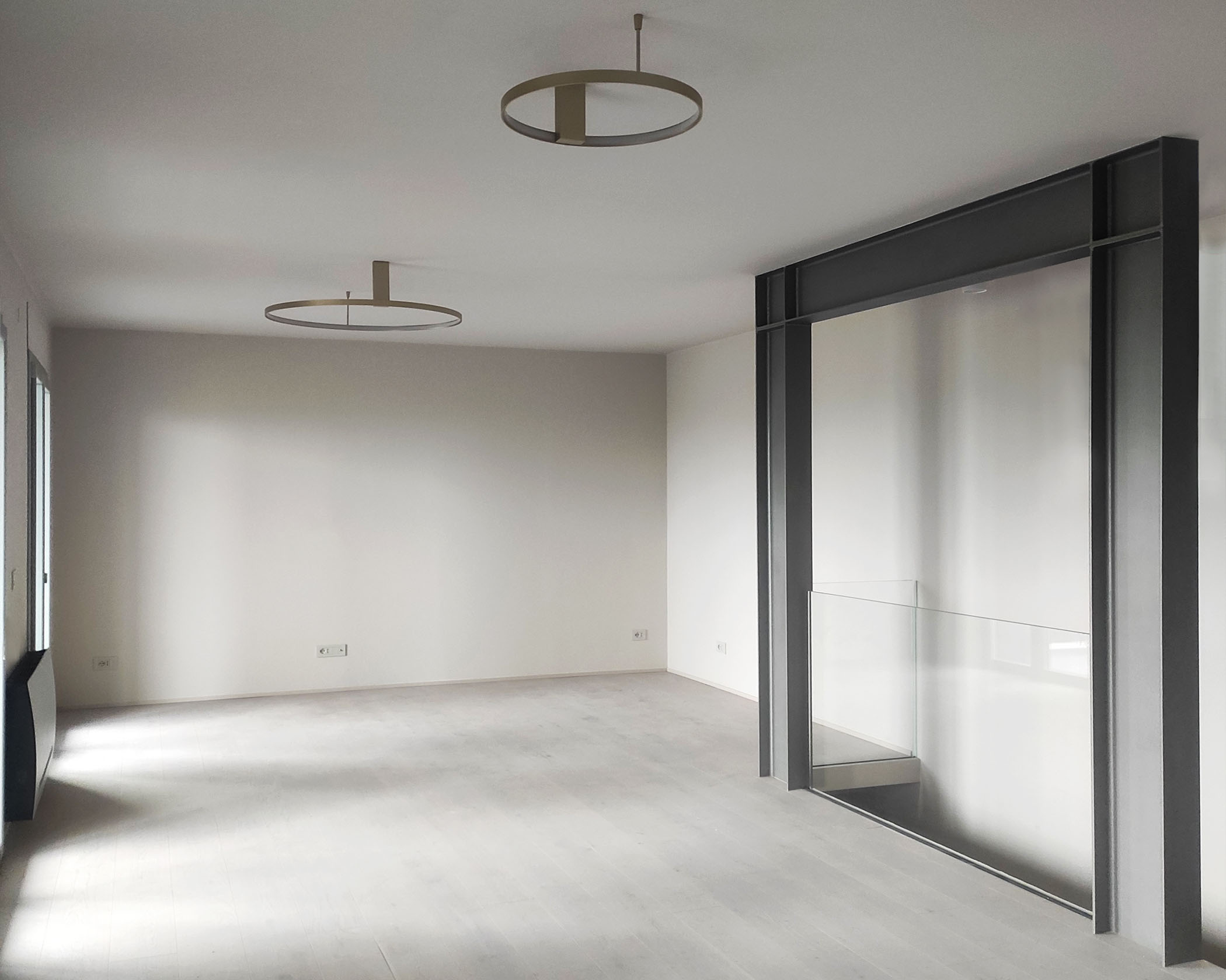 L’edificio originario è una villa con giardino, della seconda metà del ‘900, nella campagna ferrarese. Confermato nella sua natura e capace di alloggiare due nuclei famigliari in due distinte unità immobiliari, viene riorganizzato internamente, reso più efficiente e aggiornato sotto il profilo energetico, completamente rinnovato quanto a finiture e cromie specialmente interne. Le due unità vengono completamente rivisitate quanto a dimensioni e distribuzioni interne. In particolare le due unità vengono differenziate, al fine di conservarne una a maggior contatto con tutte le aree verdi del giardino perimetrale, e per il resto di dimensioni contenute ai soli spazi essenziali; la seconda invece si sviluppa in parte al piano terra e in parte al piano primo, in special modo organizzando su più livelli le zone dedicate alla socialità: al piano terra con uno spazio ampio affacciato sul giardino, al piano primo collegato mediante scala interna con uno spazio altrettanto ampio e affacciato in altra direzione esterna, quindi l’estensione su terrazza a cui il soggiorno del primo livello si collega mediante grandi aperture panoramiche. Energeticamente l’organismo edilizio è stato aggiornato e migliorato al fine del contenimento dei consumi e della gestione degli scambi fra interno ed esterno, con soluzioni capaci di attingere a risorse naturali diverse. Le finiture infine caratterizzano diversamente le due unità secondo le loro principali vocazioni, cercando accostamenti armonici con gli spazi all’aria aperta disposti sui quattro lati. All’interno le scelte materiche votate alla differenziazione delle superfici accostano comunque tonalità ora in graduale assonanza, ora in più energico distacco. Esternamente invece le assegnazioni cromatiche distinguono in modo chiaro il piano terra, il piano primo e l’ampia terrazza coperta, coinvolgendo mimeticamente gli elementi di chiusura ovvero di connessione fra gli spazi più privati e quelli invece condivisi del giardino.